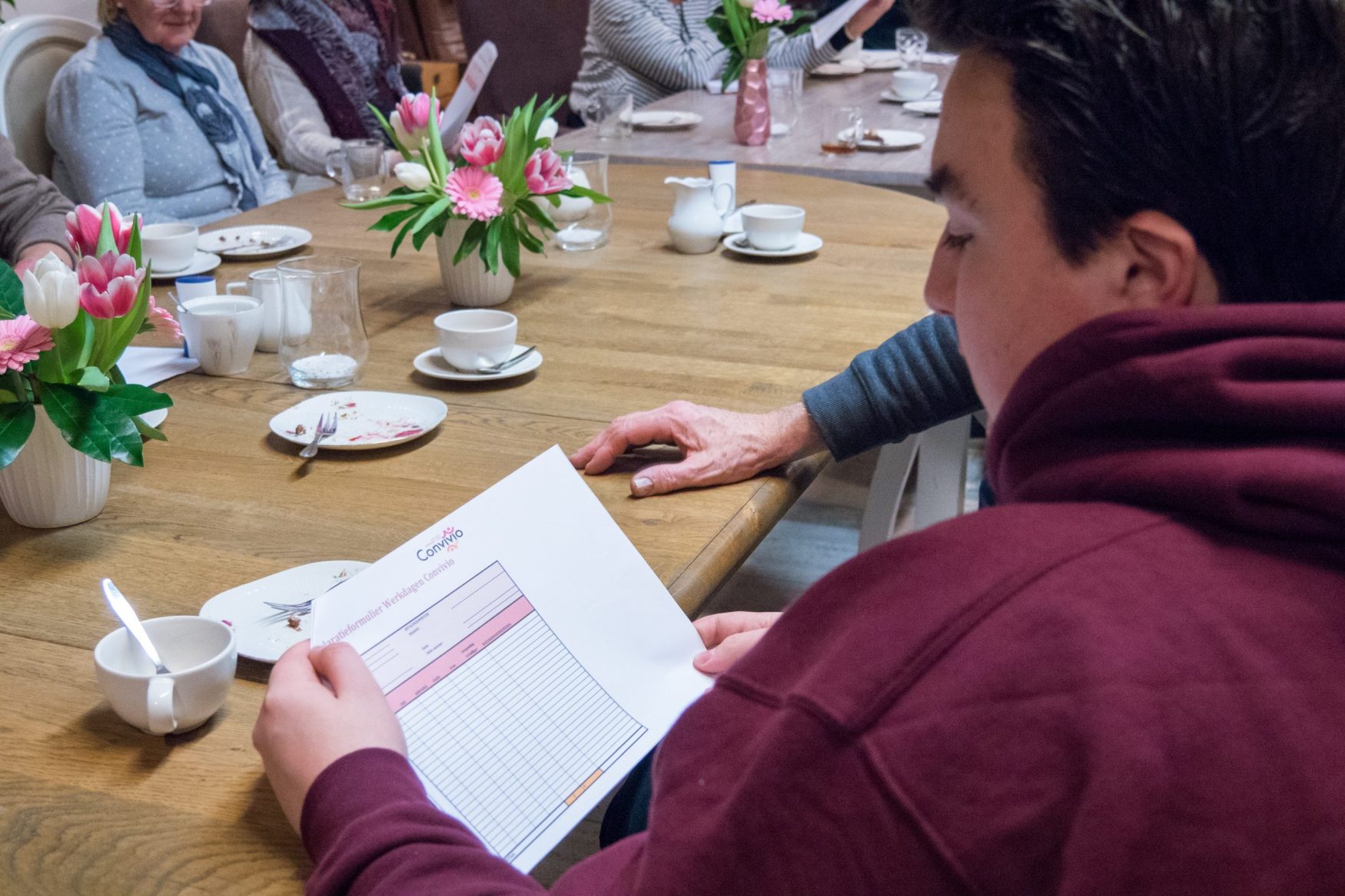 Na het openingswoord van Loek volgde een voorstelrondje, zodat iedereen direct wist met wie hij aan tafel zat en waar de medevrijwilligers werkzaam zijn. Het was erg leuk om kennis te maken met collega-vrijwilligers en bijvoorbeeld te horen wat hun werkervaring is. Wat ook leuk was om te zien, was dat er enkele mannen in het gezelschap zaten. Over het algemeen zijn de vrouwen in de meerderheid in dit soort werk – zo ook bij Convivio – dus fijn dat er ook mannen zijn die hun aandeel komen leveren. Eén van de mannen is zelfs nog maar 21, student én buurman van de dagbesteding, de plek waar hij vrijwilliger is.